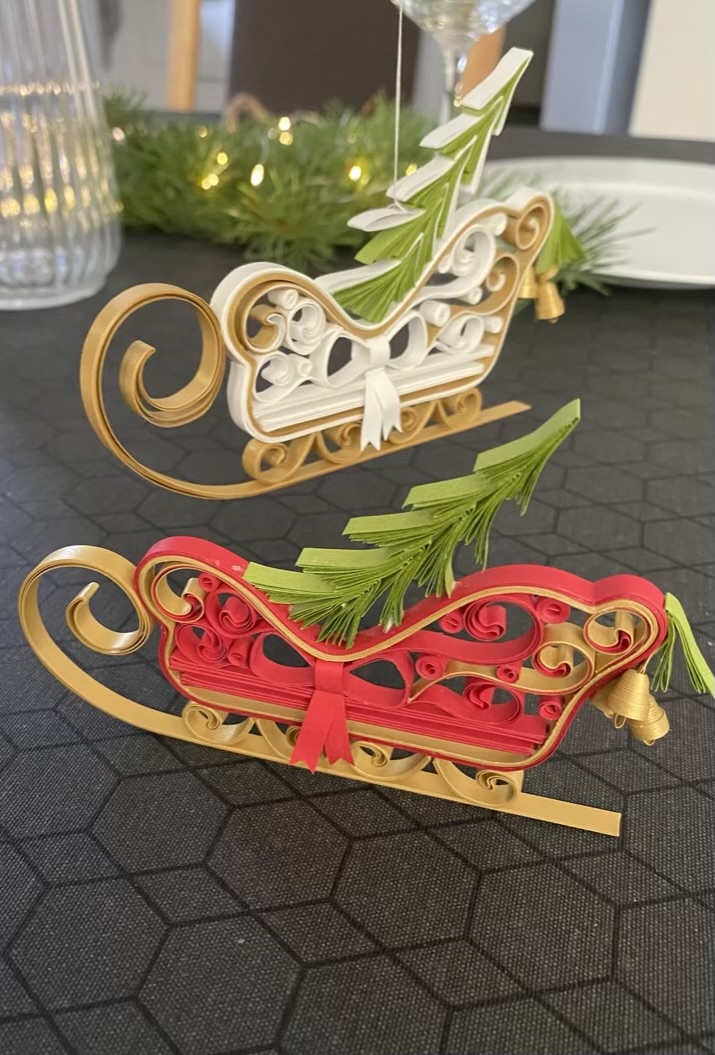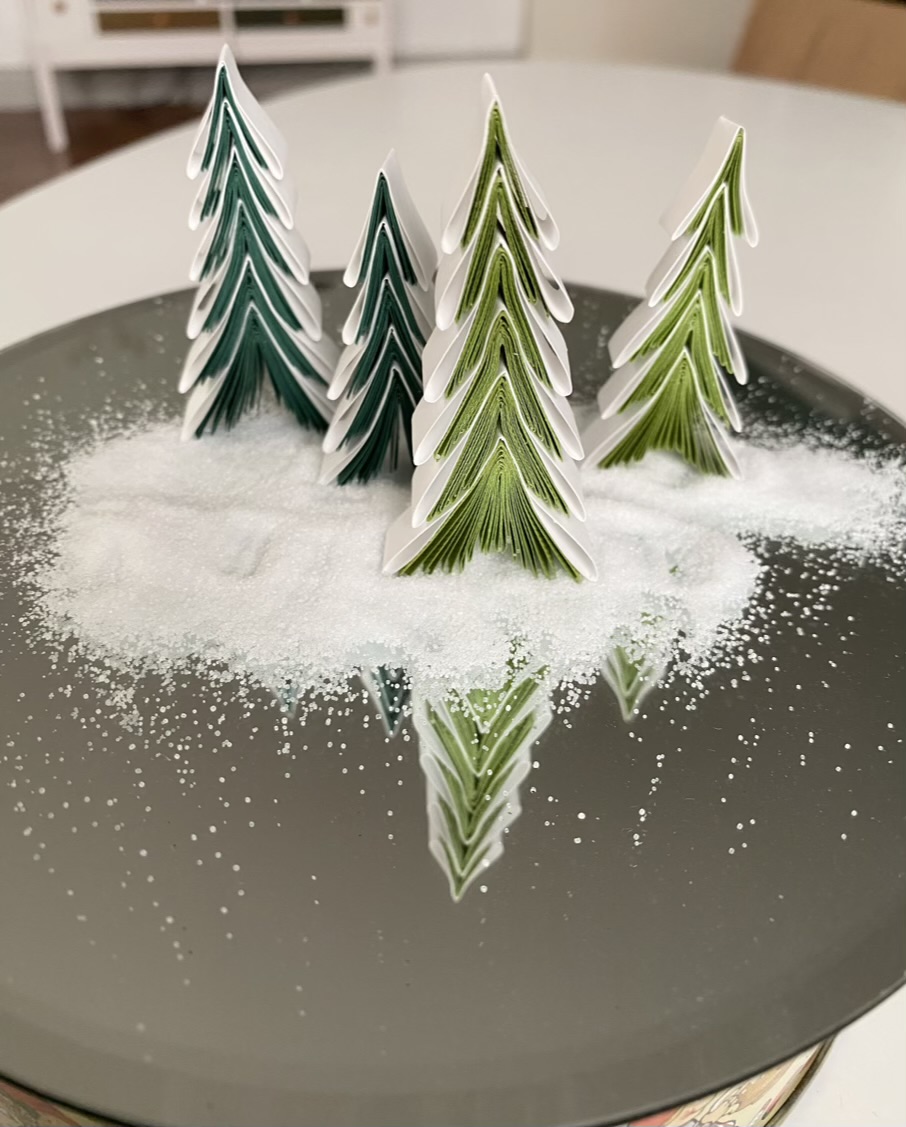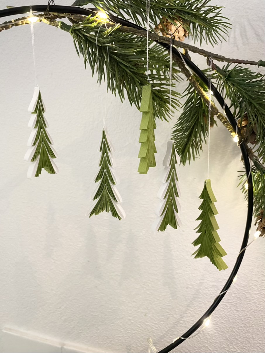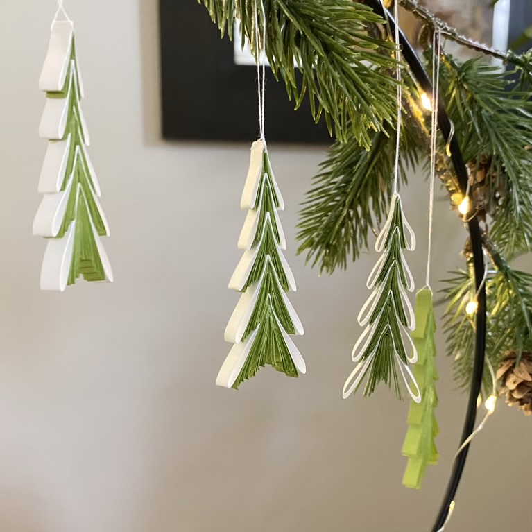 Juletræerne kan også laves til små ophæng eller som pynt på julebordet. Lav dem evt, i 10 mm strimler så de kan stå selv.